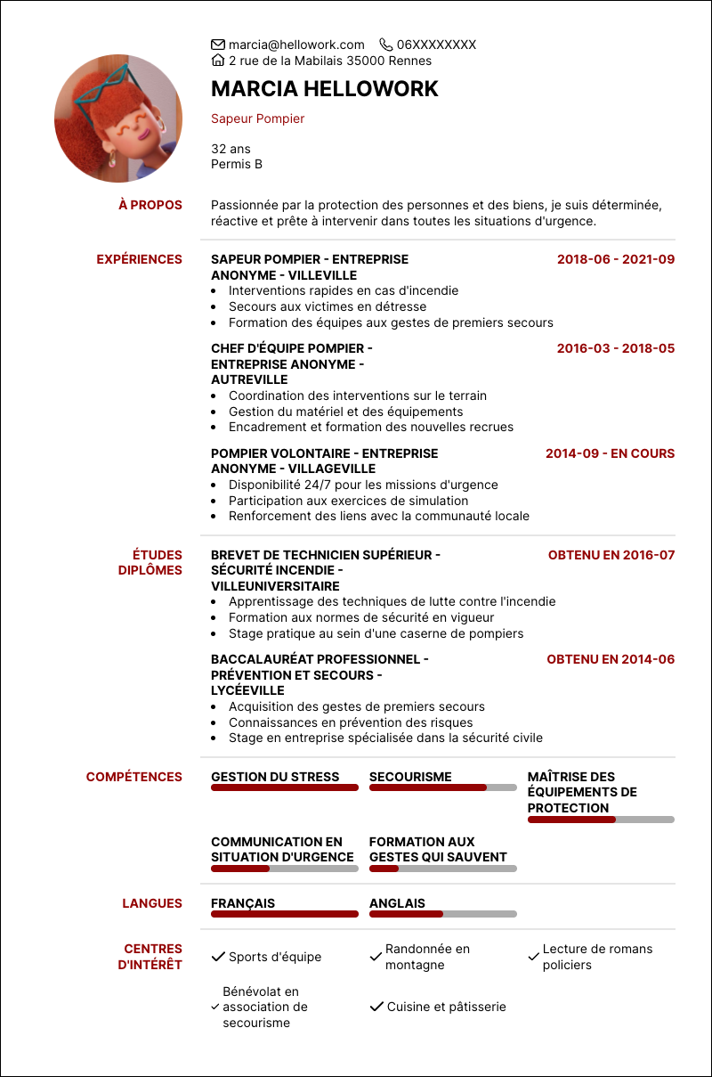 Vous êtes à la recherche d'un emploi en tant que Pompier ? Vous êtes au bon endroit ! Découvrez notre modèle de CV Pompier spécialement conçu pour valoriser votre profil. Que vous soyez expérimenté ou débutant dans ce métier, cette page vous aidera à mettre en lumière vos compétences et expériences, afin de décrocher l'emploi idéal en tant que Pompier.