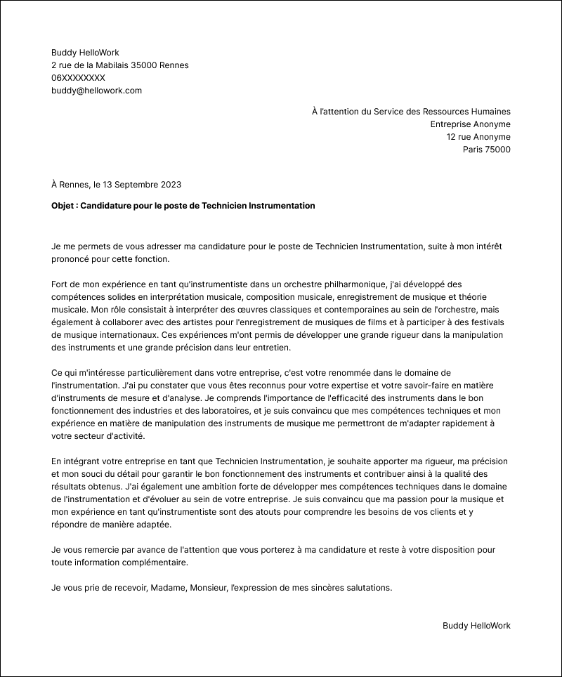 Exemple de lettre de motivation pour le métier Instrumentiste
