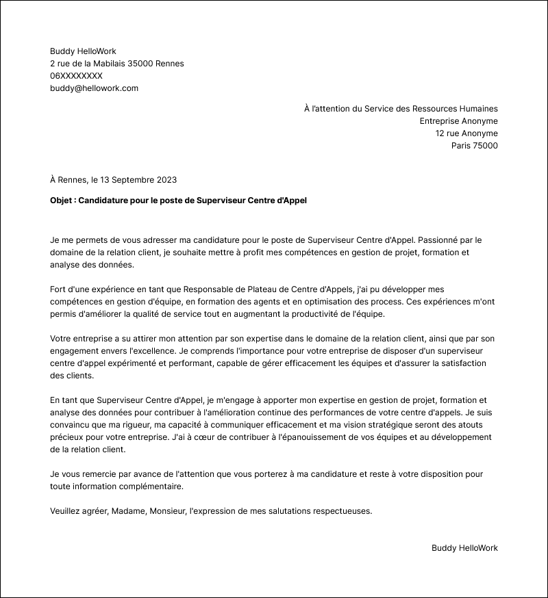 Votre entreprise a su attirer mon attention par son expertise dans le domaine de la relation client, ainsi que par son engagement envers l'excellence. Je comprends l'importance pour votre entreprise de disposer d'un superviseur centre d'appel expérimenté et performant, capable de gérer efficacement les équipes et d'assurer la satisfaction des clients.